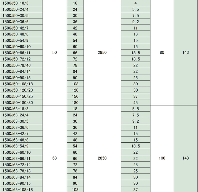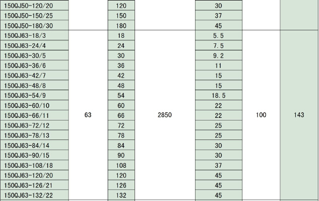 150QJ系列深井潛水泵是我公司自行開發的立式單吸多級潛水泵。泵與電機連為一體,潛入水中工作,該系列泵是深井提水的主要工具,適用于城鄉、工礦企業用水及農業灌溉。QJ泵的導殼與導殼為螺聯接,軸瓦為橡膠軸承,葉輪定位為錐套。使用條件:泵進水口至少應浸入動水位3m以下,電機底部距井底不少于5m,井應正直。同時滿足一下條件:1、水溫不高于20℃;2、水中固體含量(按重量計)不大于0.01%;3、水中的酸堿度pH值為6.5-8.5;4、水中硫化合物含量不大于1.5mg/l;5、水中氯離子含量不大于400mg/l。